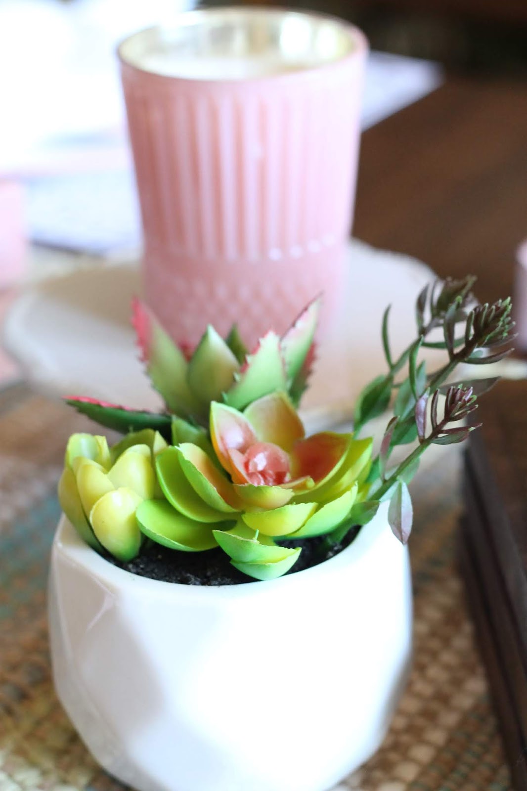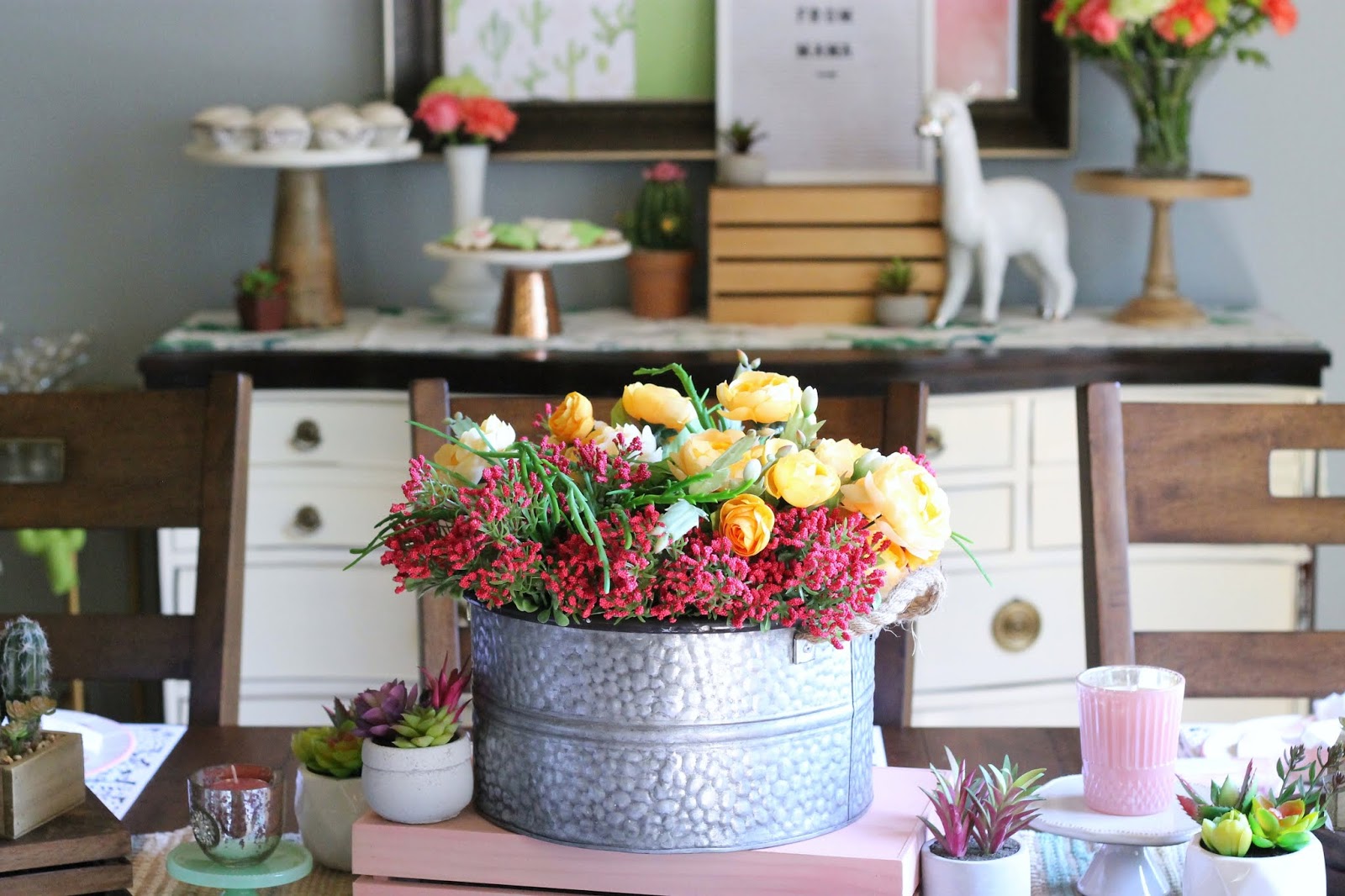 The table was decorated with cactus plants, brightly colored florals, succulents and candles with varying shades of pinks, blues, greens and neutrals. The centerpiece was a large tin filled with ranunculus, cactus leaves and bright pink stems.