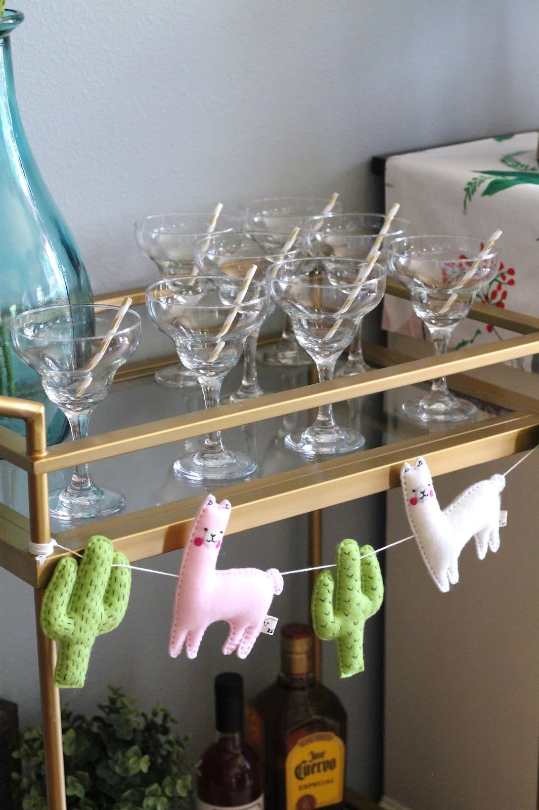 No party is complete without a little festive drink! Glasses and alcohol were set up on a bar cart, with this darling llama-cactus garland. We served traditional margaritas, and a fun blood orange version. A local distillery offers delicious vodkas in so many amazing flavors. See here to make the blood orange margarita.